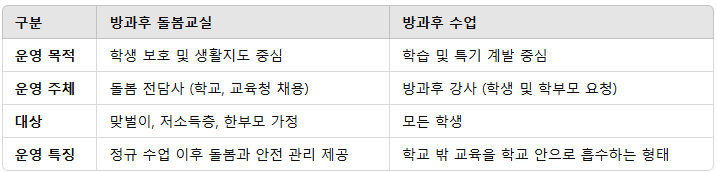 방과후 돌봄교실은 돌봄 전담사가 운영하는 보호와 지도 중심의 활동으로, 저소득층과 맞벌이 가정을 지원하는 시스템입니다. 한편, 방과후 수업은 학생과 학부모의 선택에 따라 진행되는 비정규 수업으로, 다양한 학습 및 특기 계발 프로그램을 제공합니다.